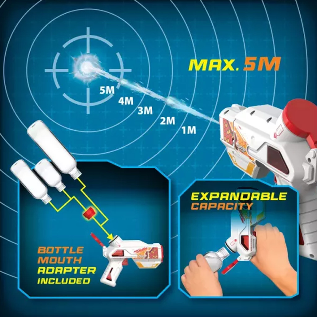 Zahvaljujući električnom pogonu nije potrebno pumpati: jednim pritiskom na gumb ispaljuje kontinuirani mlaz vode, što igru čini bržom i zabavnijom. Ugrađeni svjetlosni efekti čine ga još uzbudljivijim, posebno u sjenovitijem okruženju ili tijekom večernje igre. Pištolj ima domet do 5 metara, pa su „ciljevi” lako dostupni.