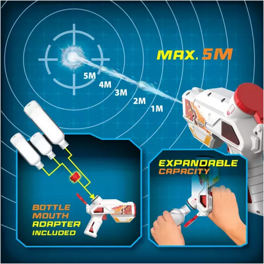 Ugrađeni svjetlosni efekti daju dodatnu uzbuđenost igri: svijetli tijekom rada, što upotrebu čini osobito atraktivnom. Uz adapter za boce koji se nalazi u paketu mogu se priključiti boce različitih veličina, čime se kapacitet spremnika za vodu može povećati prema potrebi – idealno za duže vrijeme igre.