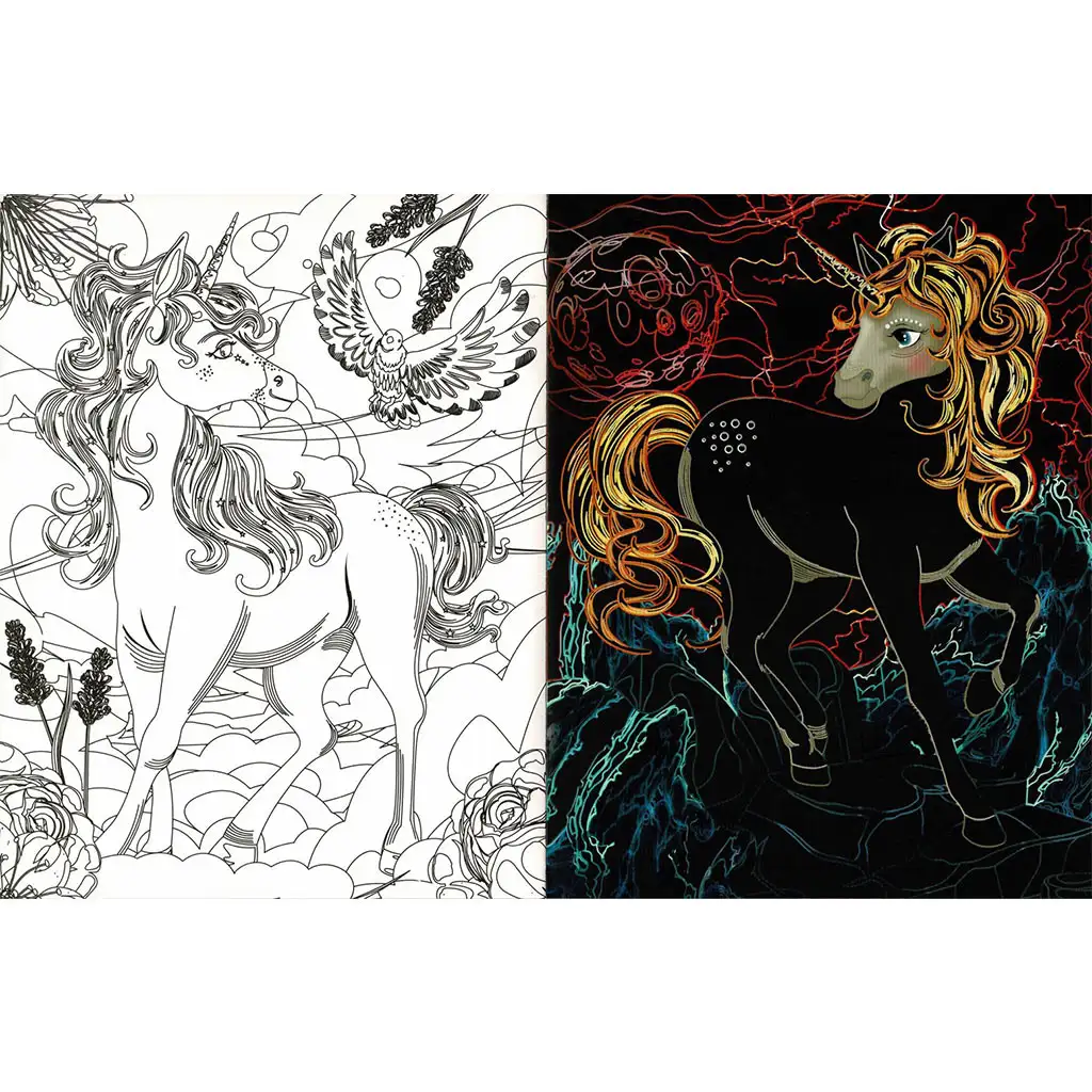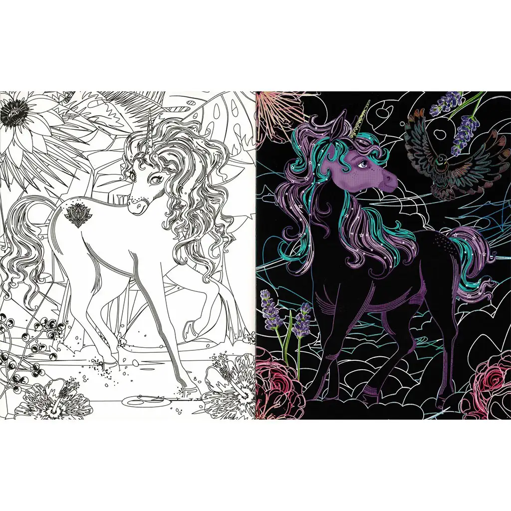 Uroni u Skriveni Svijet Jednoroga s ovim posebnim bojankom! Koristi priloženi drveni štapić za struganje kako bi uklonio crni sloj i divio se čaroliji dok se šarene slike pojavljuju na stranicama. Osim čarobnog iskustva, možeš i sam stvarati na stranicama za bojanje, a zatim istaknuti gotov rad kako bi ga podijelio s prijateljima.