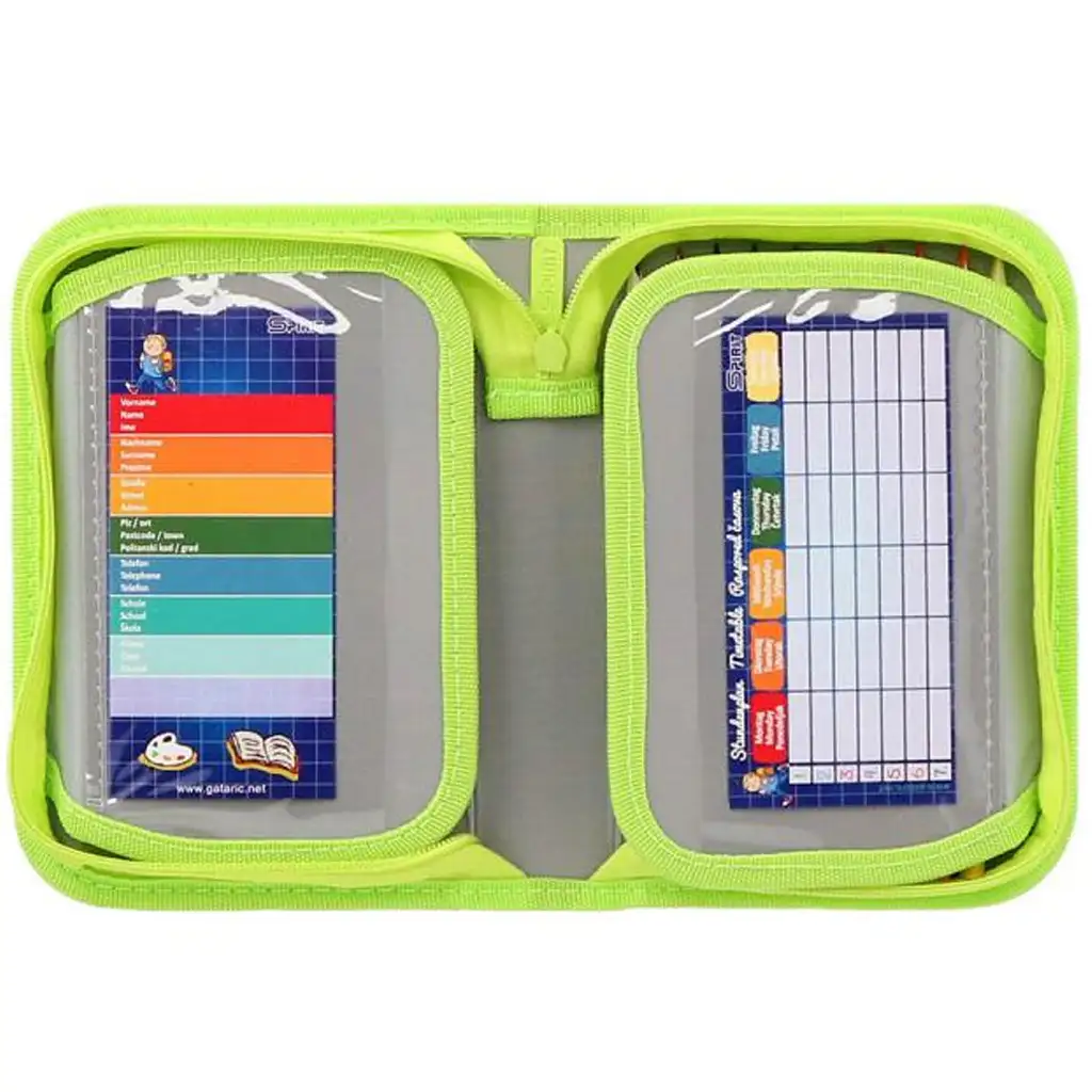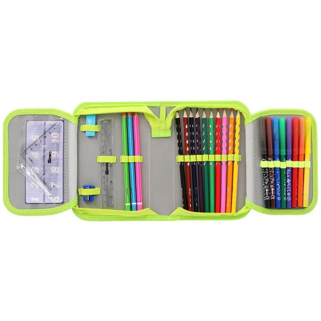 Ova pernica na rasklapanje, sa zatvaranjem na jedan patentni zatvarač, nije samo stilski privlačna, već i izuzetno praktična: iznutra se nalazi kompletan set od 28 dijelova koji čeka malog školarca. U njemu ćeš pronaći 3 grafitne olovke, 10 drvenih bojica, 8 flomastera, gumicu, šiljilo, ravnalo, trokut, naljepnicu s imenom i raspored sati. Elastične trake osiguravaju da svaki pribor ostane uredno i sigurno na svom mjestu.