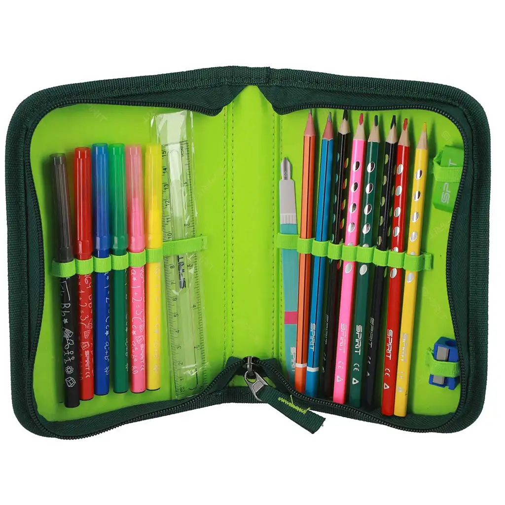Pernica s patentnim zatvaračem opremljena je priborom za pisanje kao što je prikazano na slici, ali uvijek je dobro provjeriti konkretan opis proizvoda za potvrdu sadržaja. Torba za tjelesni savršena je za treninge ili satove tjelesnog, a novčanik sigurno čuva džeparac djeteta.