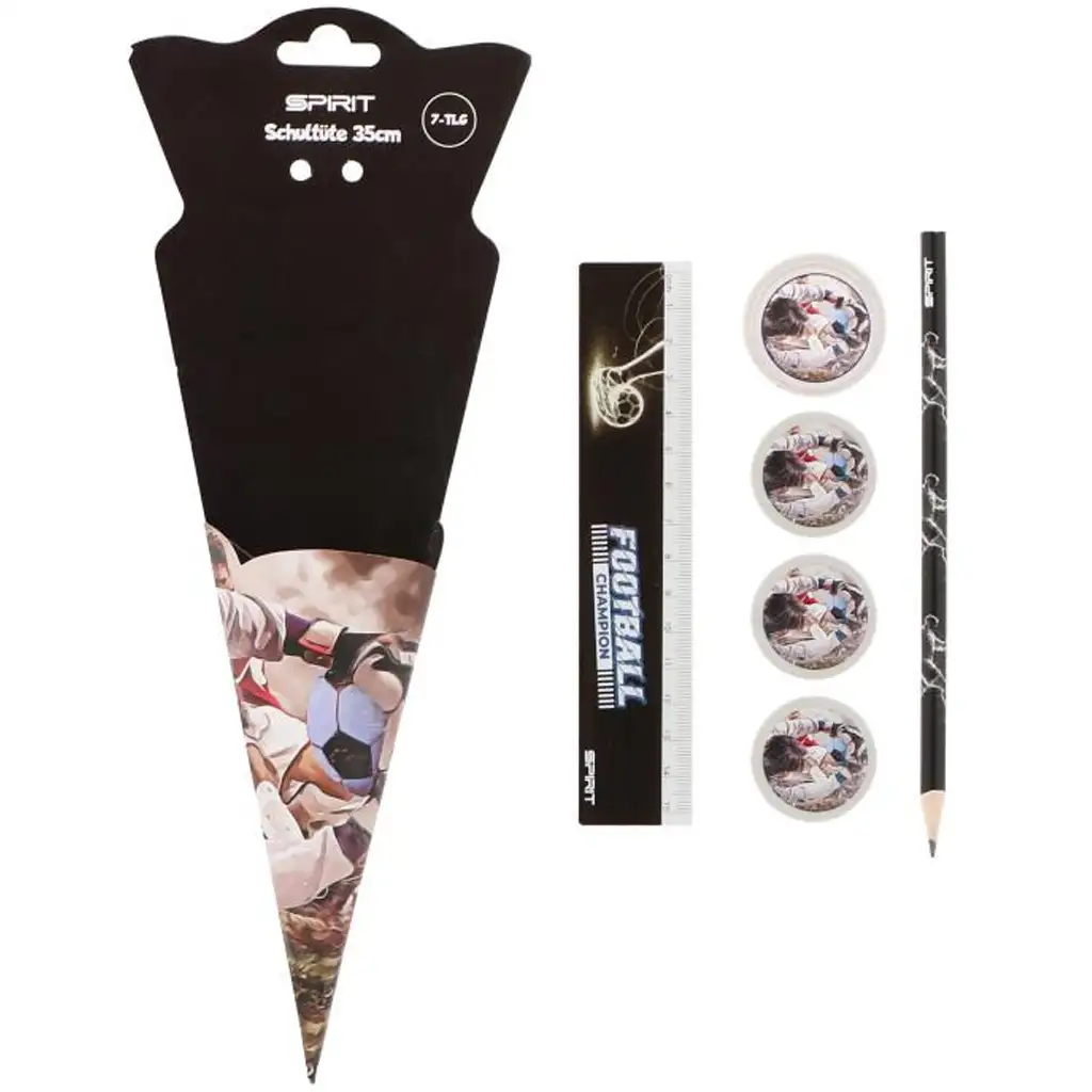 Pripremite se za školu sa stilom uz Spirit: Football nogometni set od 6 komada pribora za pisanje, koji je savršen izbor za svakog malog ljubitelja nogometa! Ovaj cool set u pakiranju u obliku školskog tuljca nije samo praktičan, već i atraktivan – može biti izvrstan poklon za početak škole ili čak kao rođendansko iznenađenje. Crna osnovna boja i sportski dizajn su zaista otkačeni i zajamčeno će se svidjeti djeci koja obožavaju nogomet.