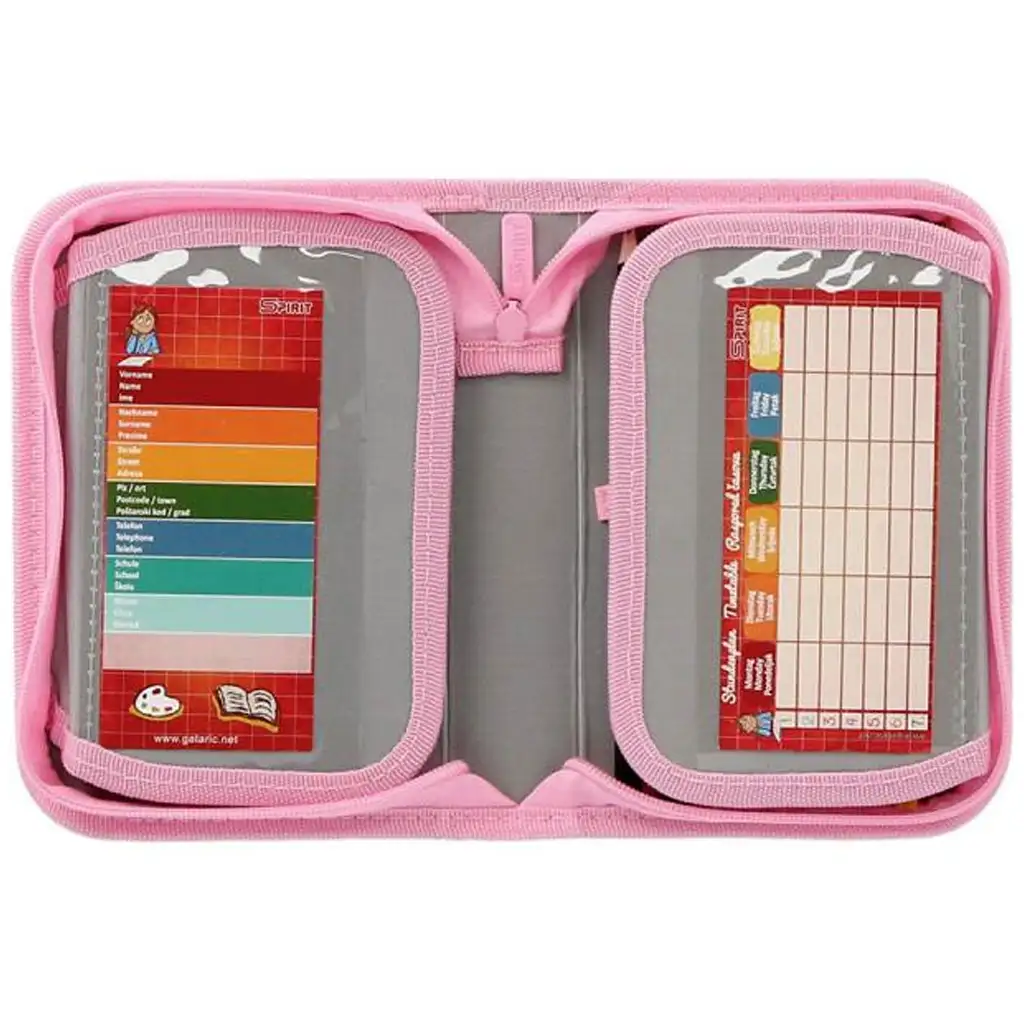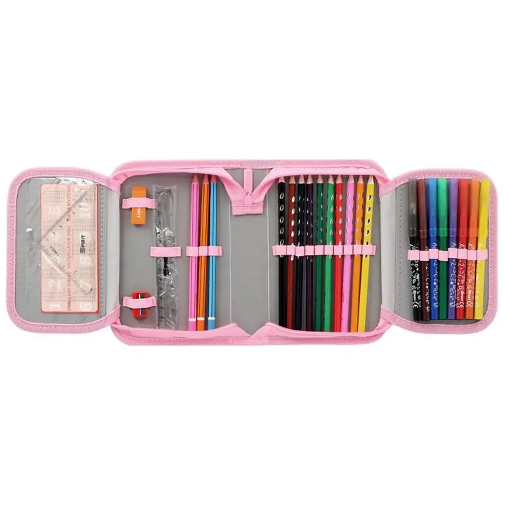 Ova pernica ima jedan patentni zatvarač i preklopni dizajn, što ju čini lako preglednom i dobro organiziranom. Unutra se krije 28 praktičnih pribora za pisanje koji sadrže sve što je potrebno za nastavu: grafitne olovke, bojice, flomastere, gumicu, šiljilo, ravnalo, kutomjer, kao i raspored sati, naljepnicu za ime i tablicu množenja. Sve je pričvršćeno čvrstim elastičnim trakama tako da sve ostaje na svom mjestu, čak i tijekom užurbanih školskih dana.