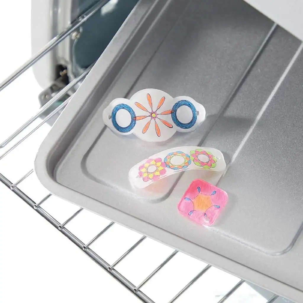Set sadrži sve što je potrebno za izradu charmova s uzorcima spirale. Dobro poznatom metodom Spirographa, djeca prvo crtaju uzorke na posebnim listovima koji se skupljaju pod toplinom. Za to mogu koristiti gumene prstenove koji drže listove na mjestu, dok uz pomoć šablona mogu stvoriti impresivne spirale i oblike. Set uključuje 7 neon boja koje čine uzorke zaista upečatljivima.