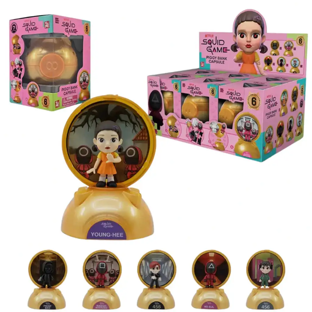 Ako ste obožavatelj jedne od najuspješnijih Netflixovih serija, Squid Game, onda će ova Piggy Bank Surprise Capsule biti obavezna za vas! Unutar ikonične zlatne kapsule skriva se kolekcionarska mini figura visoka oko 7 cm, koja postaje vidljiva tek nakon otvaranja – tako da je svaki komad pravo iznenađenje! Posebna kapsula nije samo zabavna, već i praktična: njezin se vrh može pretvoriti u stalak, tako da figura dobiva jedinstvenu pozadinu i elegantnu bazu na vašoj polici.