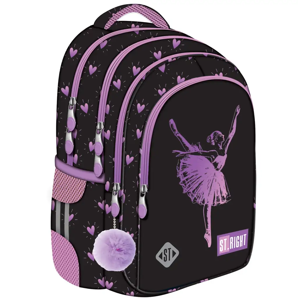 St.Right Ballerina školska torba BP58 savršen je izbor za svako dijete koje voli balerine, ples i moderan izgled. Ruksak ima elegantnu i modernu crnu osnovnu boju koju krase ljubičasta srca, sjajni uzorci i prekrasna grafika balerine. Dizajn dodatno obogaćuju praktični dodaci poput slatkog ljubičastog pompona. Ovaj ruksak je istovremeno moderan i praktičan, zbog čega je idealan pratilac za svakodnevni odlazak u školu.