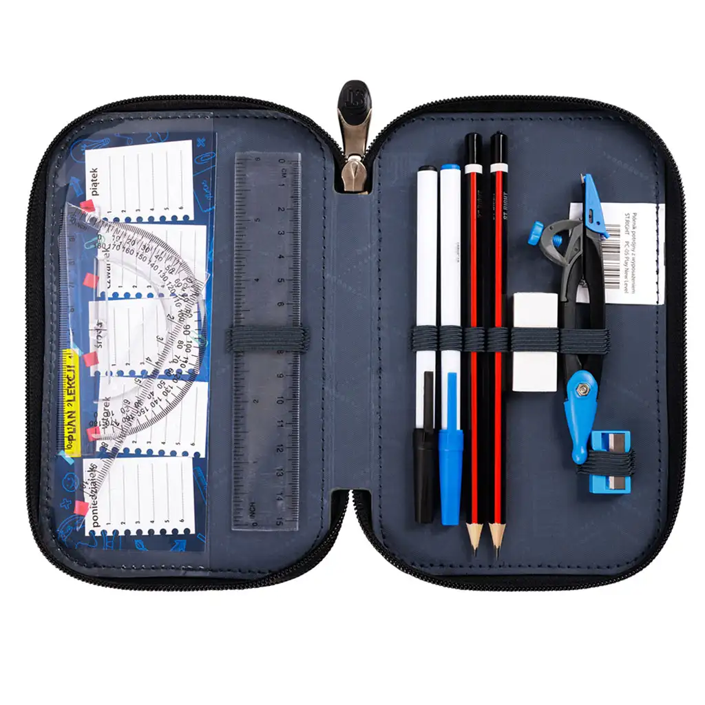Pernica ima dva odvojena pretinca s patentnim zatvaračem, koji pružaju dovoljno prostora za školski pribor. Ergonomski dizajnirani patentni zatvarači i izdržljiva, ojačana konstrukcija osiguravaju da pernica dugoročno zadrži svoj oblik i zaštiti pohranjeni pribor. Zahvaljujući promišljenom unutarnjem rasporedu, sav pribor je lako dostupan i organiziran.