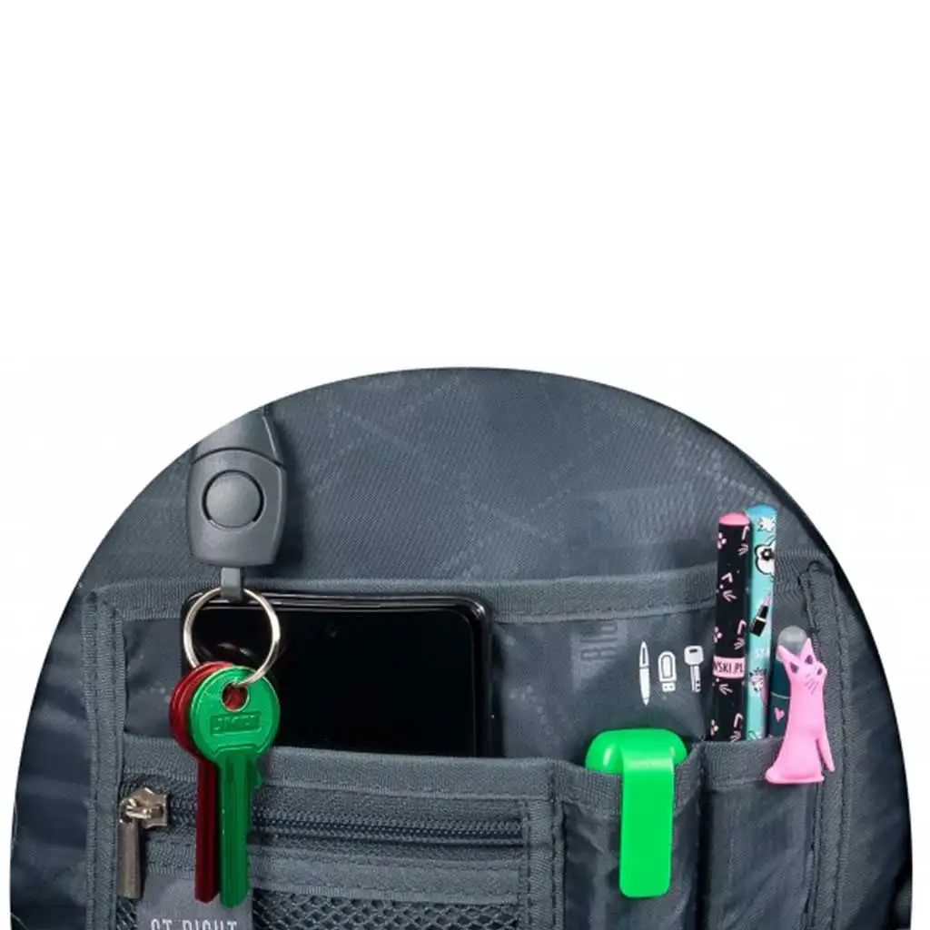 Ruksak ima četiri prostrana pretinca koji pružaju dovoljno prostora za sve školske potrebe. U glavnom pretincu nalazi se podstavljeni džep koji sigurno drži laptop ili tablet. Prednji pretinci nude praktične unutarnje pregrade kako bi sve sitnice poput olovaka, ključeva i drugih dodataka ostale uredne. Unutar ruksaka nalazi se i odvojivi privjesak za ključeve kako bi ključevi uvijek bili pri ruci.