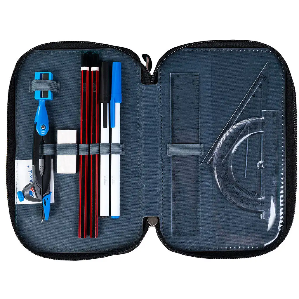 - Sadržaj: 18 bojica, 9 flomastera, šestar, šiljilo, gumica, 2 olovke, 2 kemijske olovke, ravnalo, kutomjer, trokutasti ravnalo