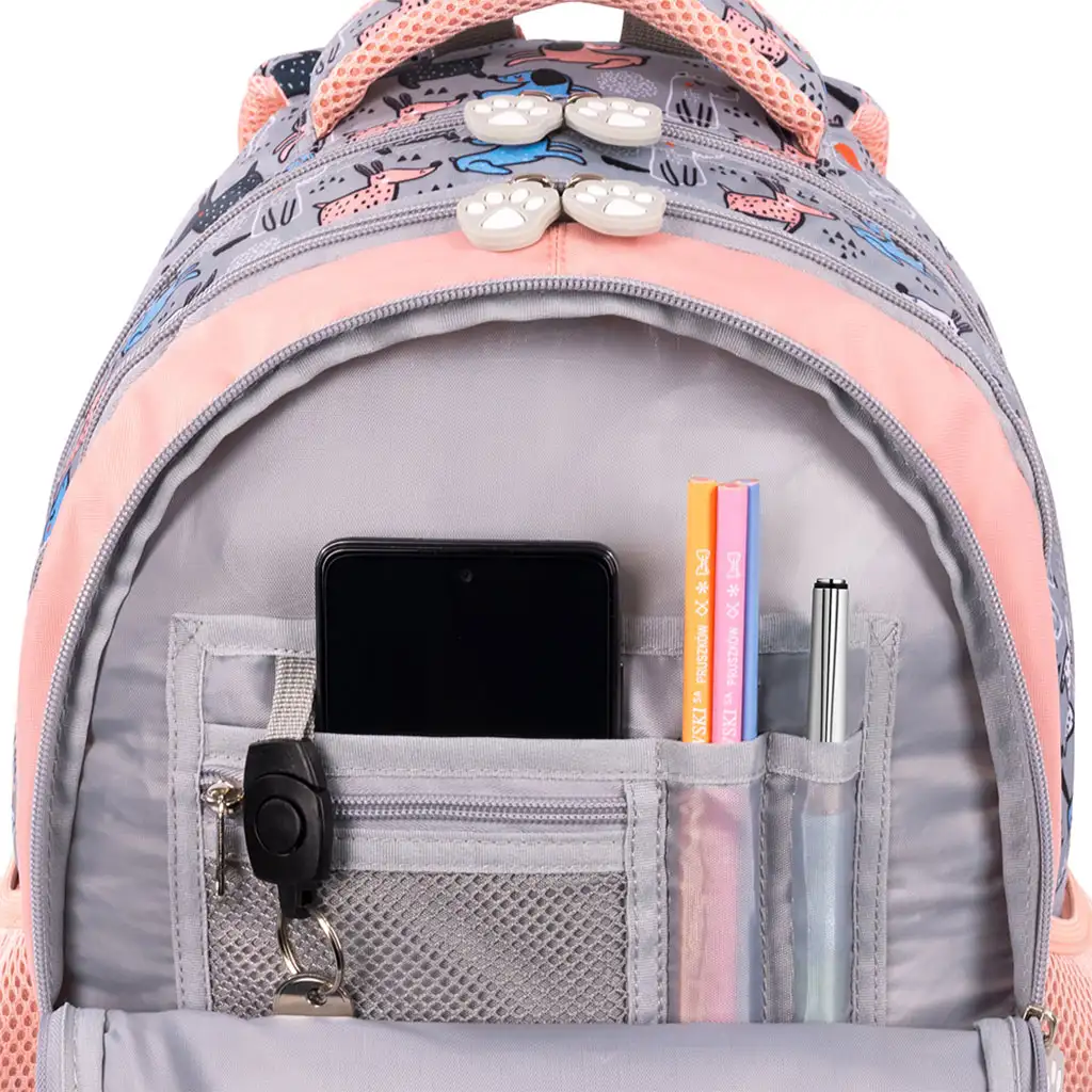 Vanjski dio torbe ukrašen je veselim uzorcima pasa, što će sigurno oduševiti vaše dijete. Četiri odvojena pretinca pružaju dovoljno prostora za udžbenike, bilježnice i druge školske potrepštine, tako da sve ostaje uredno. Dva bočna, elastična džepa idealna su za boce s vodom ili manje predmete.