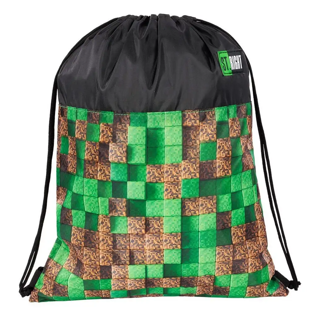 St.Right Pixel Cubes torba za teretanu je moderan i praktičan dodatak, idealan za školsku tjelesnu kulturu, sportske aktivnosti ili vikend izlete. Dimenzije su mu 43x34 cm, što osigurava dovoljno prostora za sve potrebne stvari. Izgled torbe je zaista jedinstven: gornji dio je crn, dok je donji dio ukrašen pikseliziranim uzorkom koji podsjeća na zemlju i travu, evocirajući susret prirode i digitalnog svijeta.