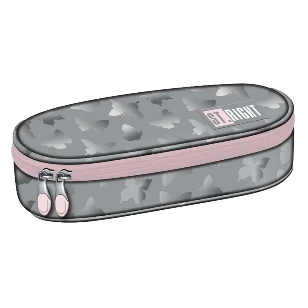 St.Right Silver Butterflies ovalni pernica savršen je izbor za sve učenike koji vole ukusne i profinjene dodatke zahvaljujući elegantnom i suptilnom dizajnu. Pernica veličine 23x9,5x6 cm izrađena je s prekrasnim uzorkom leptira na srebrnosivoj podlozi, koju upotpunjuju nježno ružičasti patentni zatvarač i privjesak. Ovaj moderan izgled idealan je za sve uzraste, bilo da se radi o mlađim ili starijim učenicima.