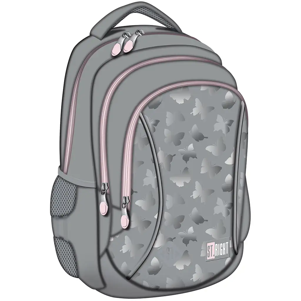 St.Right Silver Butterfly trodijelni školski ruksak BP26 savršen je izbor ako tražite elegantan, a istovremeno praktičan i udoban školski ruksak za svoje dijete! Stilizirana siva podloga i suptilno sjajne leptir-motive daju ovom ruksaku moderan izgled. Diskretni ružičasti patentni zatvarači dodaju nježnu ženstvenost, zbog čega je posebno popularan među djevojčicama.