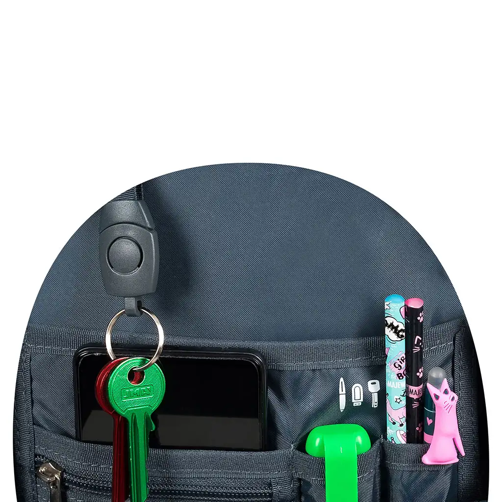 Lako skladištenje dostupnih predmeta omogućuje poseban organizator s privjeskom za ključeve, dok prsni remen i podesive naramenice drže ruksak stabilnim. Ručka omogućuje vješanje ruksaka, tako da mu možete lako pristupiti.
