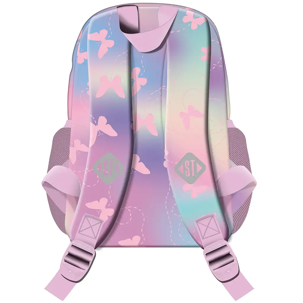 St.Right Ruksak za školu s ružičastim leptirićima BP70 prekrasan je izbor za svaku djevojčicu koja voli nježne, čarobne boje i slatke uzorke. Dizajn ruksaka u ružičastim i pastelno prelijevajućim nijansama ukrašen je finim leptirićima i sitnim crtežima, koji odišu razigranom i bajkovitom atmosferom. Svjetloružičasti detalji, poput patentnih zatvarača i naramenica, još više ističu ljupkost ruksaka.