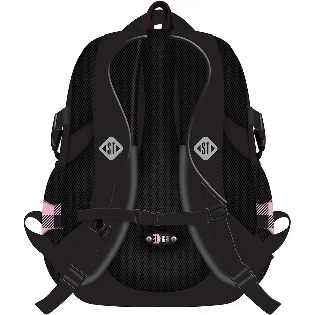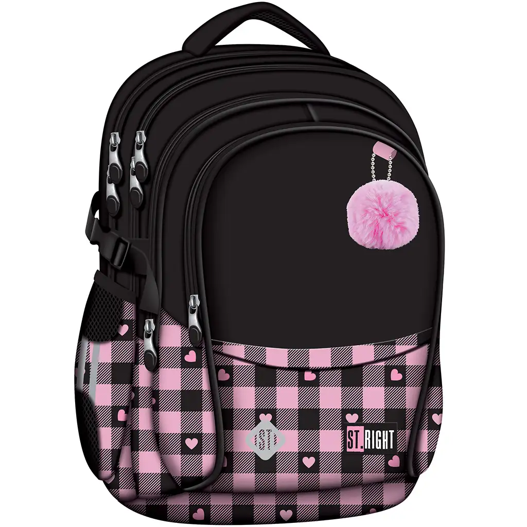 St.Right Pink-Black Heart školska torba BP01 pravo je stilsko i praktično rješenje za svaku školarku koja voli slatki i jedinstveni izgled! Ružičasto-crni karirani uzorak ukrašen malim srcima, kao i pahuljasti ružičasti privjesak na prednjoj strani torbe, daju ovom ruksaku zaista šarmantan izgled, pa će ga vaše dijete s veseljem nositi svaki dan.