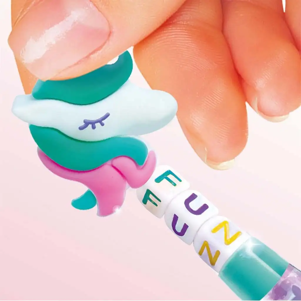 Središnji dio Tvornice olovaka je praktičan lijevak-dozator, pomoću kojeg se unutrašnjost olovaka lako može napuniti šljokicama, mini ukrasima ili perlicama. Set je dovoljan za izradu 6 različitih olovaka, uključujući 2 markera, tako da igra nije samo kreativna, već i praktična – izrađene olovke odmah se mogu koristiti za crtanje ili učenje. Vesele boje i slatki motivi (mačka, jednorog, otisak šape, jagoda itd.) očarat će svakog malog kreatora.
