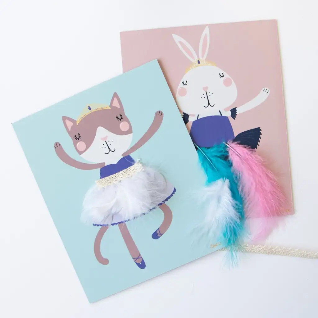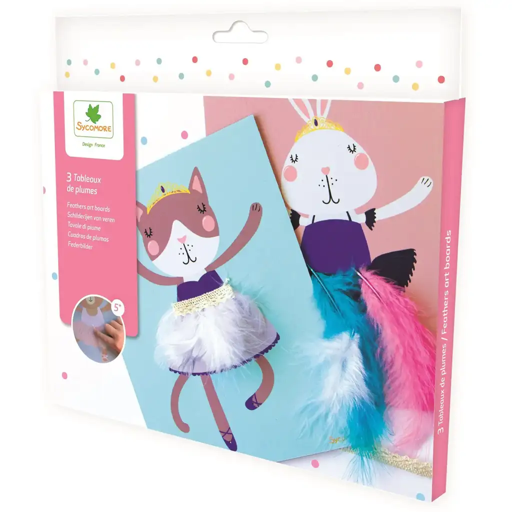 Sycomore set za izradu slika od perja pravi je san za svakog malog kreativca koji obožava slatke životinjske figure, sjaj i šarena pera! Ovaj set oživljava tri šarmantne male životinjske figure – mačku, zeca i medvjedića – u til suknjama, s ukrasnim pojasom i mekanim, šarenim perjem. Djeca mogu ukrasiti odjeću figura prema vlastitom ukusu, stvarajući jedinstvene i upečatljive slike koje se ponosno mogu izložiti u sobi.
