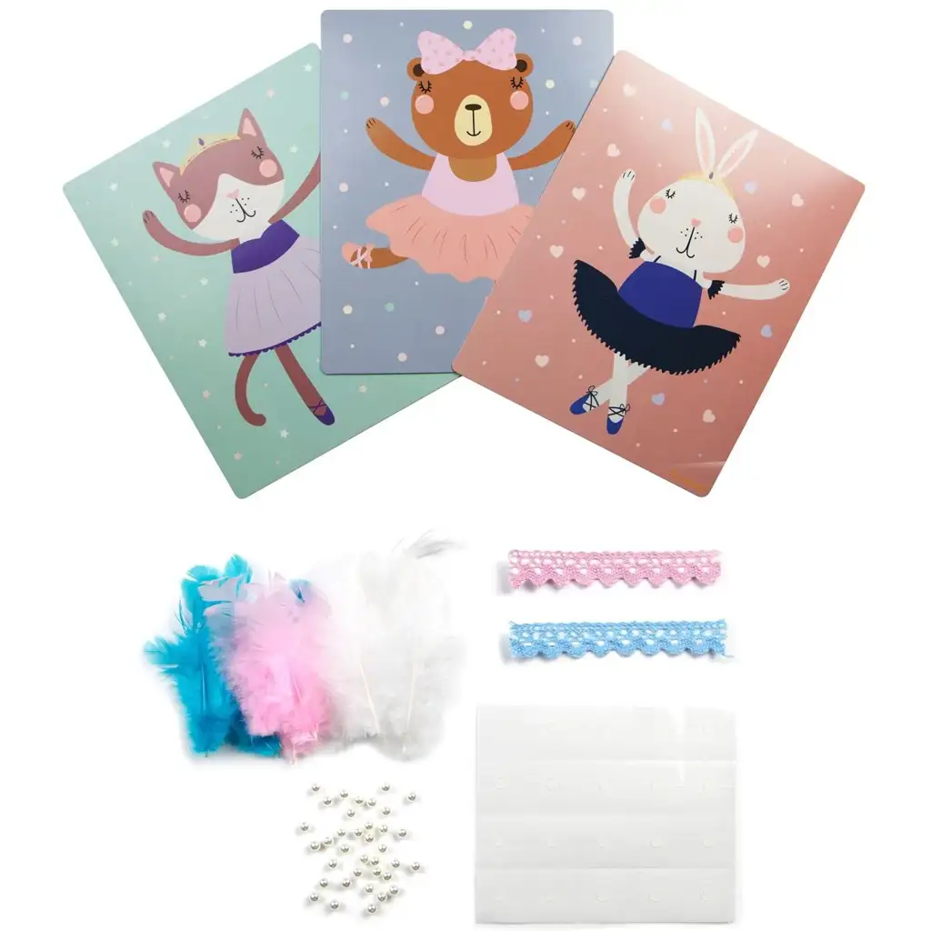 Set sadrži sve potrebne materijale, od perja, perlica i čipkastih traka do ljepljivih točkica, pružajući sve za zabavno kreativno poslijepodne. Zadatak je jednostavan: slijedite uzorak ili pustite mašti vašeg djeteta na volju i neka ukrasi male balerine u svom stilu. Tijekom kreativnog vremena razvijaju se fina motorika, spretnost, koncentracija i estetski osjećaj.