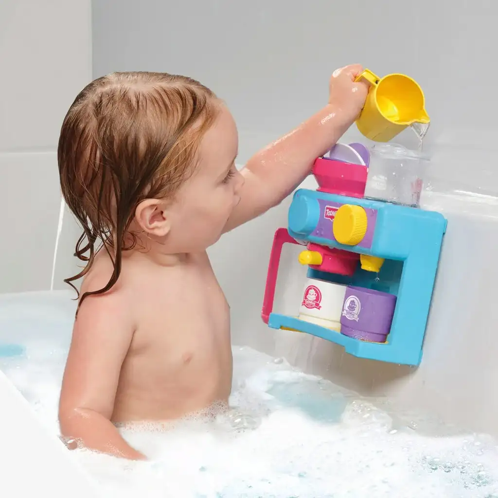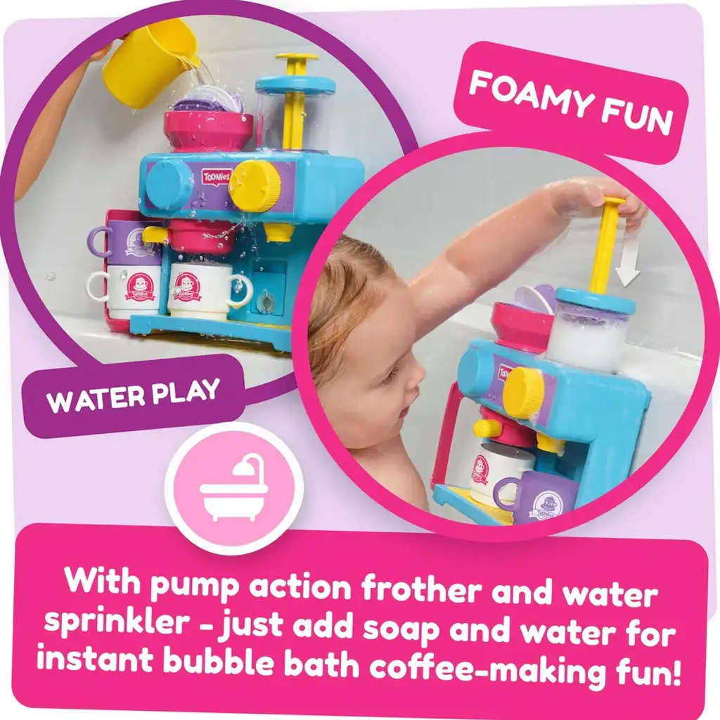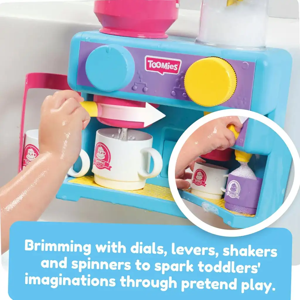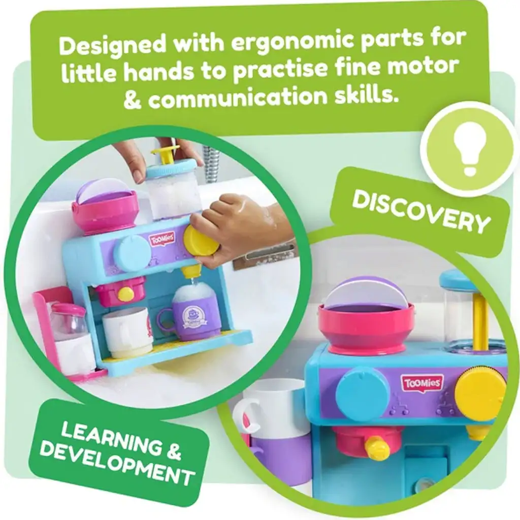 Tomy Toomies kupaonica ostvaruje san svakog malog vlasnika kafića - kafić u kadi! Ovaj set igračaka izrađen od kvalitetne plastike uključuje aparat za kavu, šalice, šećernicu i prijateljski mali vrč za mlijeko. Aparatom za kavu djeca mogu napuniti kupku i aktivirajući ga na različite načine, mogu "kuhati" mirisni kupka-espresso. Šalice iz seta mogu se lako smjestiti u držač pored aparata za kavu.