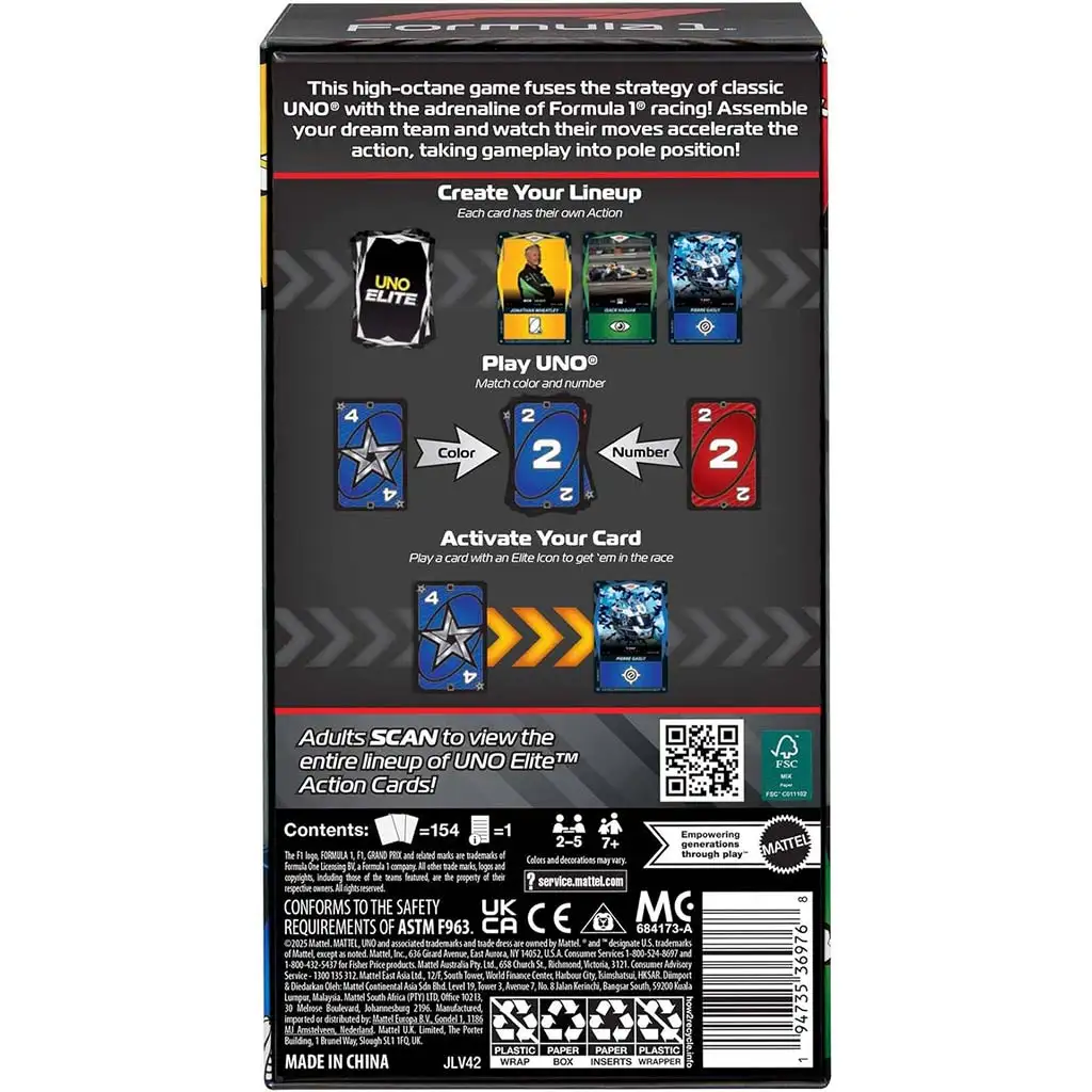 Osnova igre i dalje je provjerena UNO mehanika: potrebno je slagati karte po boji ili broju, a pobjeđuje onaj tko se prvi riješi svih svojih karata. No, Elite karte podižu igru na novu razinu: akcije inspirirane Formulom 1 aktiviraju posebne efekte kojima možeš ubrzati, usporiti protivnike ili potpuno promijeniti tijek igre. Karte s pravim F1 vozačima i legendarnim stazama dodatno uzbuđuju svaku partiju.