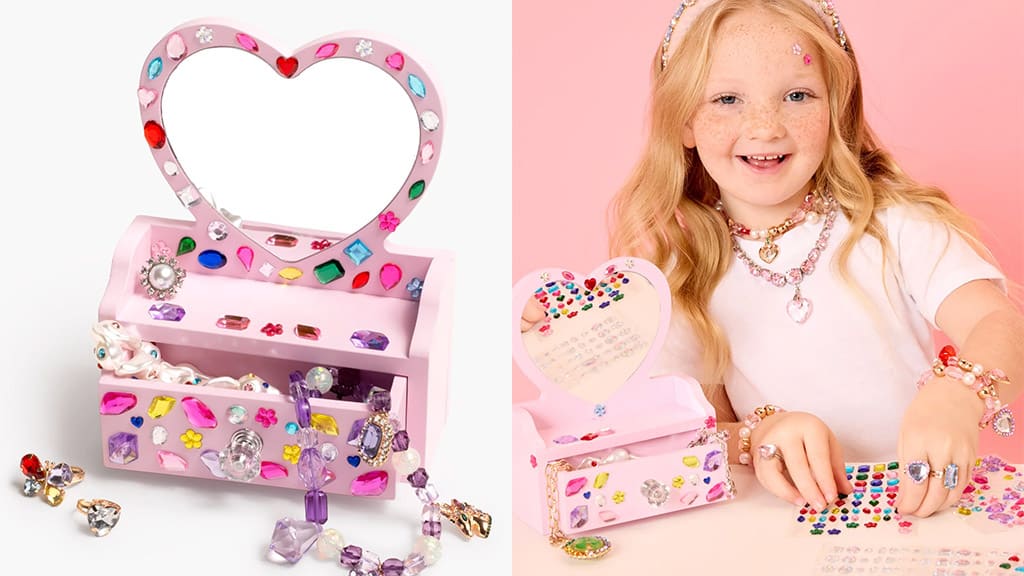 Zasjaj u svojim GRWM (Get Ready With Me) trenucima s ovim mini toaletnim stolićem! Ovaj poseban komad savršen je izbor ako voliš šminkanje, izradu frizura ili jednostavno želiš provesti malo vremena za sebe. Zahvaljujući kompaktnoj veličini lako će se uklopiti u tvoju sobu, a ipak na njega možeš smjestiti sve potrebne dodatke. Bilo da se radi o brzom jutarnjem spremanju ili popodnevnom druženju s prijateljicama, ovaj mini toaletni stolić pruža stilsko i praktično rješenje za svaku priliku. Otkrij svijet sjaja i kreativnosti te si priušti pravi zvjezdani doživljaj u svom domu!Dodaj malo **sjaja** i **čarolije** svojim svakodnevnim danima uz **Mini Vanity Gemify set za izradu rukotvorina**! Ovaj **ružičasti toaletni stolić** sa **zrcalom u obliku srca** djeca mogu ukrasiti **šarenim kamenčićima** i **sjajnim naljepnicama s kristalićima** kako bi ga učinila zaista jedinstvenim. U setu se nalazi **polica** i **praktična ladica** koje su savršene za spremanje dječjih **ogrlica**, **narukvica**, **ukosnica**, kao i **četke za kosu Style and Shine Gemify ukrašene dragim kamenjem**. Ovaj set ne samo da potiče kreativnost, već pomaže i u **organizaciji** i **dekoraciji sobe**, tako da se svaka djevojčica može osjećati kao prava princeza!
