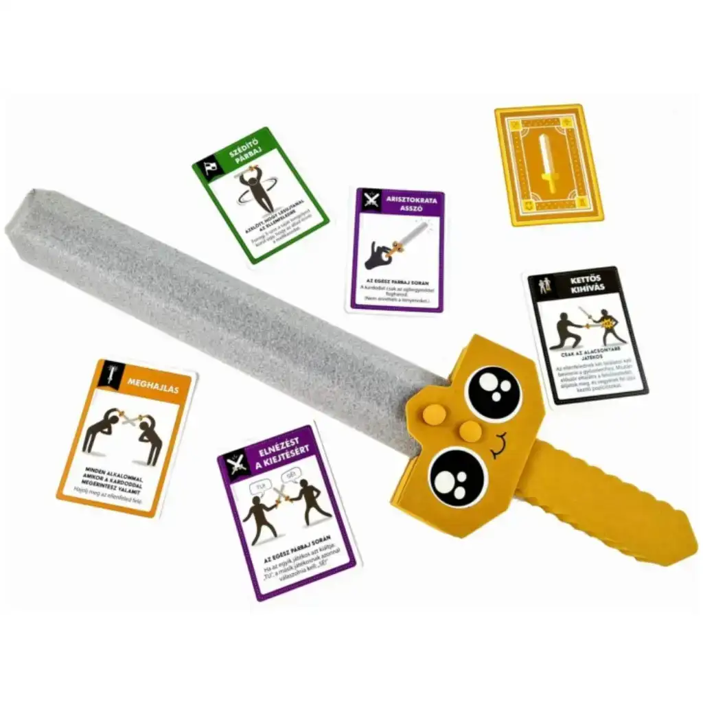 Društvena igra "Mačujemo se spužvastim mačevima" zajamčeno će uljepšati svako obiteljsko ili prijateljsko okupljanje! U ovoj ludo smiješnoj party igri igrači ne samo da skupljaju karte, već se za njih doslovno bore – i to s mekim, sigurnim spužvastim mačevima. Tijekom igre potrebno je skupiti tri seta karata, ali ako dva igrača ciljaju na isto, slijedi dvoboj s raznim zabavnim pravilima: balansiranje, naklon, smiješni pokreti i još mnogo toga. Tijekom mačevanja, osim vještine, prednost su i kreativnost i humor.