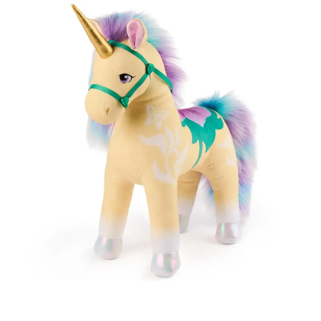 Na čarobne avanture poziva jedan od najposebnijih stanovnika čarobne Akademije Jednoroga – Leaf! Ovaj plišani jednorog visine 38 cm, mekan i nježan na dodir, ne samo da potiče dječju maštu, već im se svojim šarmom i toplinom brzo uvlači u srce. Šarmantni jednorog sa zlatnim rogom i veselim bojama – s pastelnim žutim tijelom, sjajnim kopitima, grivom i repom u ljubičasto-plavim tonovima – unosi pravu bajkovitu atmosferu u dječju sobu.