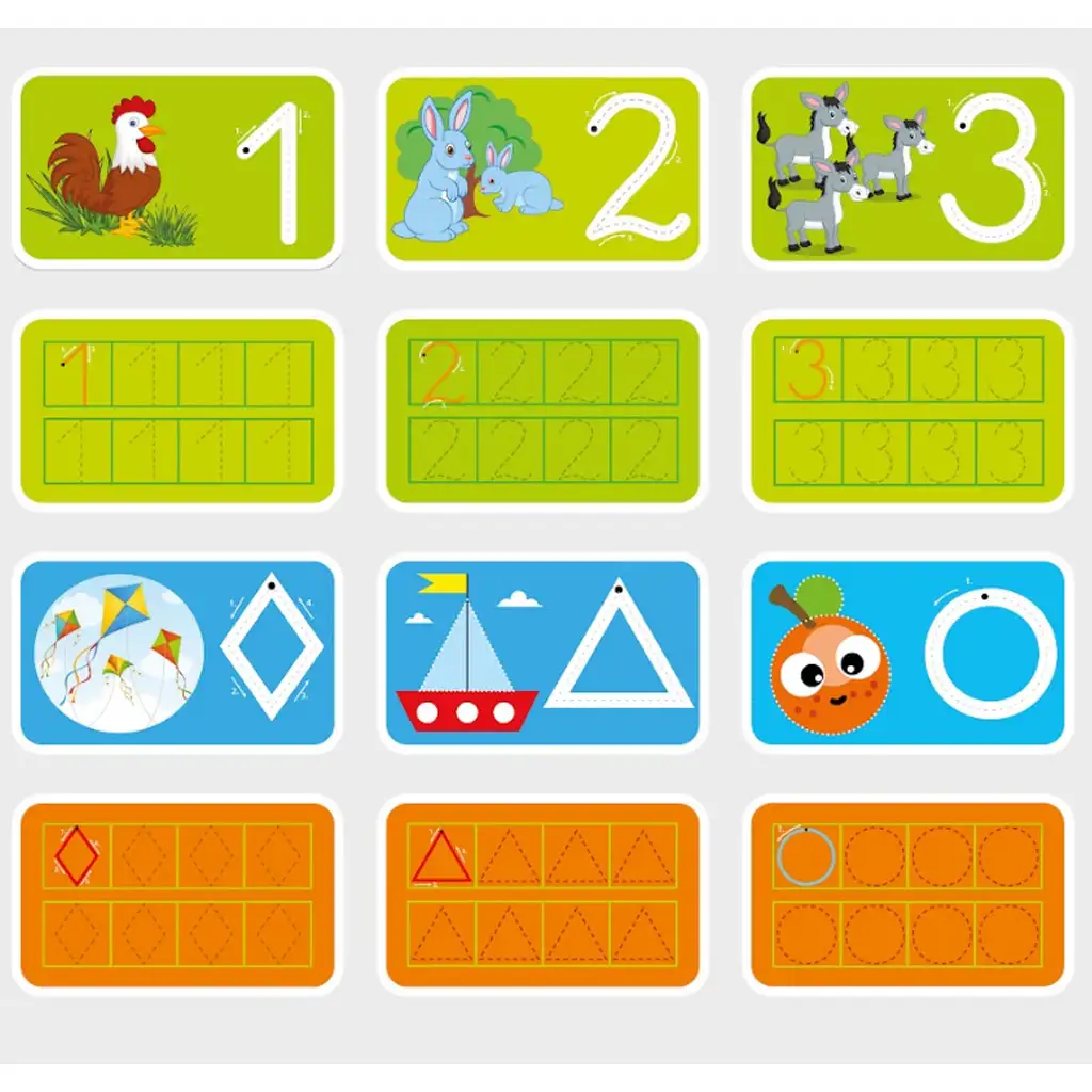 Igra pomaže u usvajanju pravilnog pisanja brojeva i prepoznavanju osnovnih geometrijskih oblika. Šarene, vesele ilustracije, poput zečeva, brodova ili zmajeva, razigrano privlače pažnju mališana, dok učenje postaje ugodno iskustvo. Kartice su izrađene od izdržljivog materijala, a njihov kompaktan oblik omogućuje da ih ponesete sa sobom na putovanja.