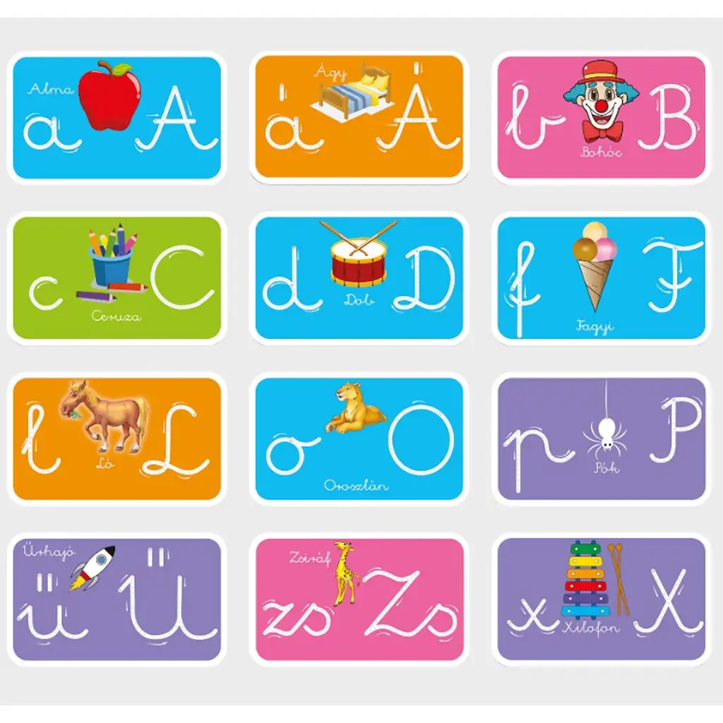 Paket sadrži 12 dvostranih, brisivih kartica koje upoznaju djecu s slovima mađarske abecede. Osim vježbanja velikih i malih slova, svaka kartica sadrži veselu ilustraciju i povezanu riječ, na primjer "A" kao jabuka, "B" kao klaun ili "Ž" kao žirafa. Priloženi brisivi flomaster omogućuje djetetu da iznova i iznova vježba pisanje slova, čineći set dugoročno korisnim.