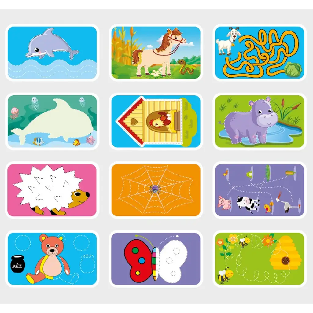 Paket sadrži 12 dvostranih kartica, na svakoj od kojih djecu očekuje drugačiji zadatak sa životinjama. Među zadacima se nalaze vježbe vođenja linija, labirinti, povezivanje točaka i dopunjavanje uzoraka. Kartice su perive, tako da se zadaci mogu rješavati iznova i iznova s priloženim flomasterom, osiguravajući kontinuiranu praksu i mogućnost učenja.