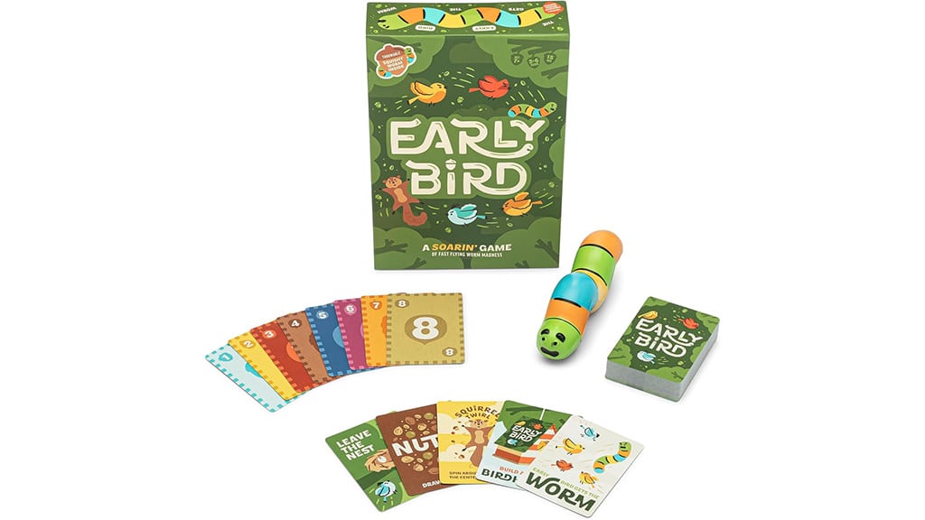 Među dodatne kartice izazova spadaju i Vjeveričji vrtuljak, gdje se igrači moraju okretati u krug, a zatim brzo udariti po središnjoj hrpi, kao i Ptičje hranilište, u kojem igrači moraju iz karata izgraditi ptičje hranilište. Odigraj pet divljih rundi, és onaj igrač koji ima najviše kartica izazova, izlazi kao pobjednik. Igra se može završiti za manje od 15 minuta ili čak i brže, így igrači rado igraju iznova i iznova, jer uvijek žele još!Perje će letjeti, a smijeh je zajamčen uz igru Early Bird, koja je sada dostupna. Može se kupiti na Amazonu i putem sljedećih poveznica. Ova igra je savršen izbor za obiteljska i prijateljska okupljanja, jer pruža zabavu za sve uzraste. Isprobaj je i uživaj u veselim trenucima sa svojim najmilijima!Poleti s igrom Early Bird! U ovoj kartaškoj igri igrači se natječu tko će se prvi riješiti svojih numeriranih karata ptičje hrane, dok istovremeno ispunjavaju zabavne izazove. Takav je, na primjer, Karta gliste, kada treba baciti mekanu, spužvastu glistu u zrak i uhvatiti je, dok svi pokazuju najsmješniju imitaciju gliste. Igra zajamčeno ispunjava zajednički proveden vrijeme smijehom i uzbuđenjem, a pritom razvija brzinu i kreativnost.