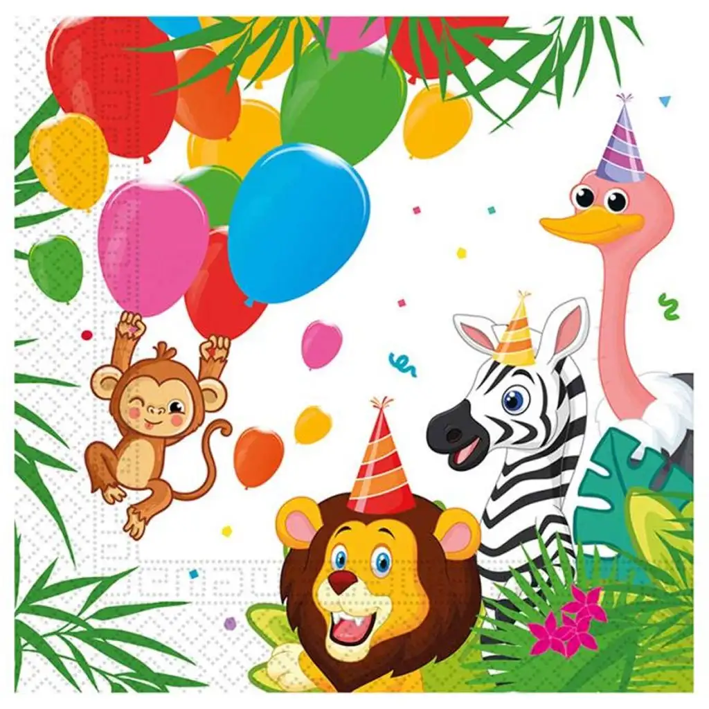 Stvorite pravu džunglu atmosferu za dječju zabavu s ovim šarenim i veselim papirnatim salvetama! Slatki majmun, lav, zebra i noj u party kapama čekaju da se mali gosti pridruže šumskoj zabavi. Među mnoštvom šarenih balona i zelenih biljaka vlada vesela, razigrana atmosfera – savršen izbor za rođendansku džungla zabavu.