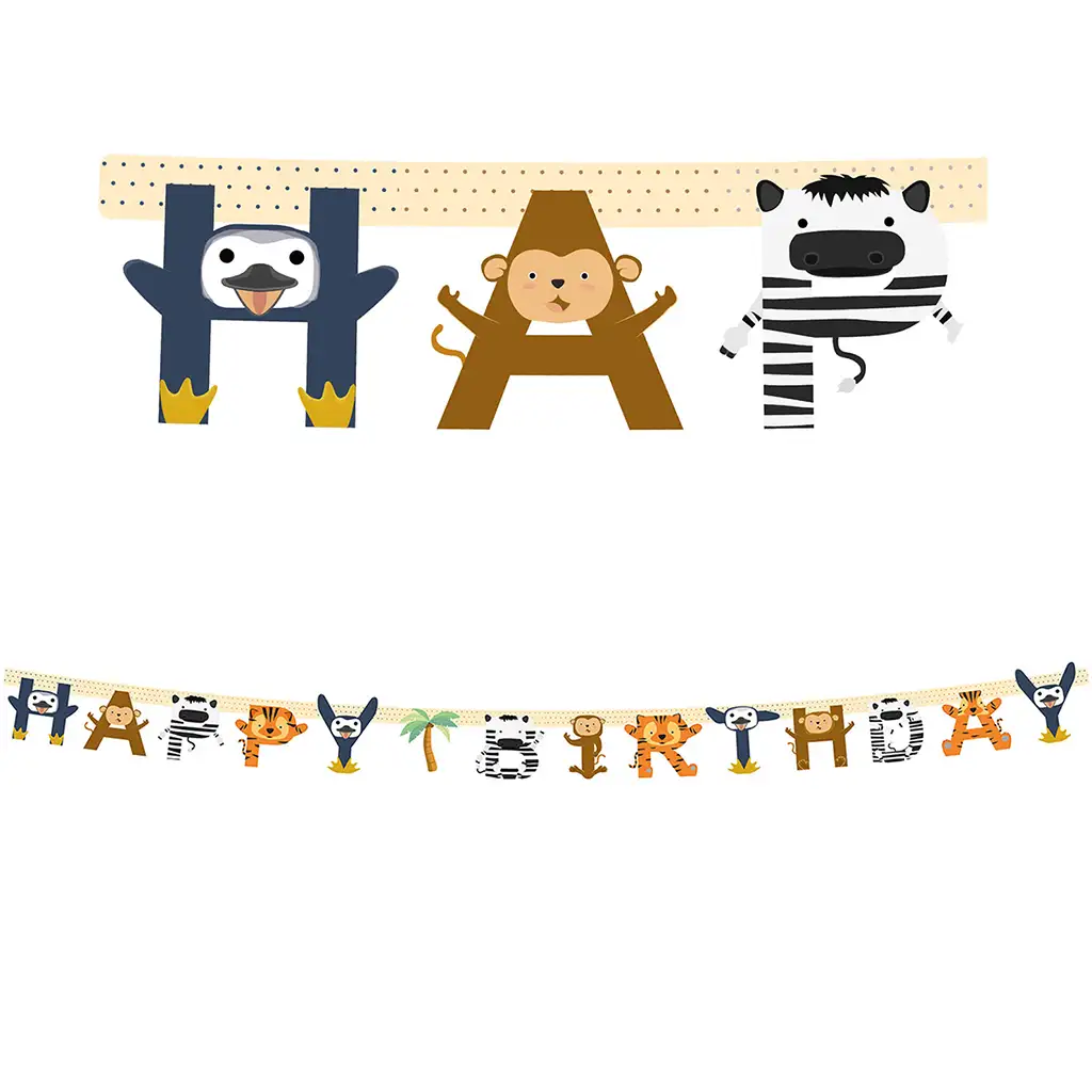 Ovaj zabavan i šareni banner s temom veselih životinja savršen je izbor ako želiš veselu atmosferu i životinjsku tematiku za rođendansku dekoraciju! Natpis "Happy Birthday" ukrašen je simpatičnim džungla i savana životinjama – uključujući pingvina, majmuna, zebru, tigra i mnoge druge prijateljske likove koje će djeca sigurno obožavati.