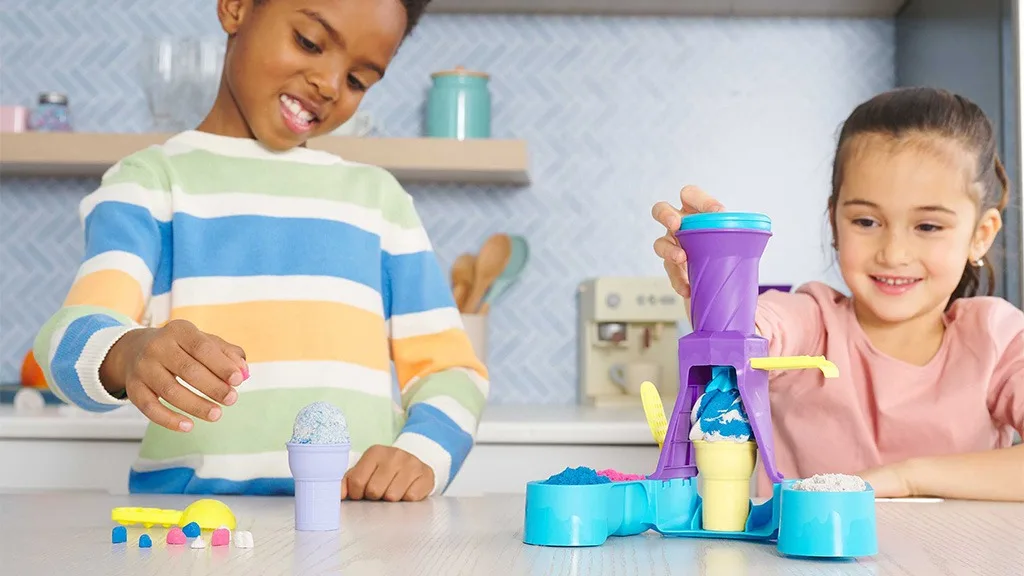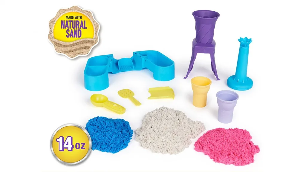 Jednostavan i lako upotrebljiv set za igru sadrži dozator koji omogućuje djeci da stvore karakterističan oblik mekog sladoleda u obliku spirale. Set uključuje sladolednu žlicu, plastične čašice i kinetički pijesak u tri boje: roza, plavu i nježno bijelu.I naravno, uživanje u sladoledu nije potpuno bez nekoliko završnih dodira. Djeca mogu koristiti oblike na dršci sladoledne žlice da stisnu male čips od pijeska ili da pritisnu pijesak kroz sito kako bi dodali konfeti dodir.