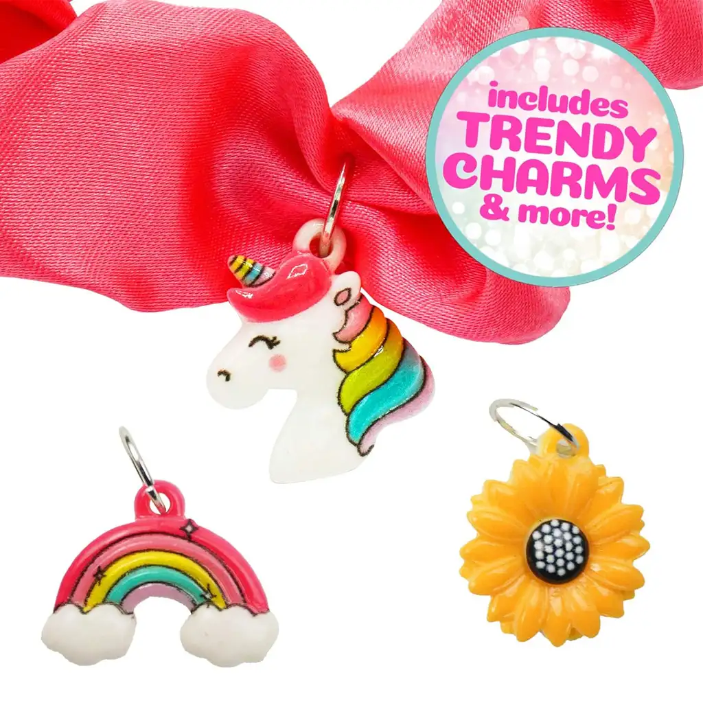 Ovaj DIY set pruža izvrsnu priliku za razvoj i izražavanje kreativnosti djece, jer mogu izrađivati modne dodatke. Set je posebno dizajniran za izradu gumica za kosu, pa sadrži mnogo satenskih traka, uz gumene trake koje čine osnovu gumice.