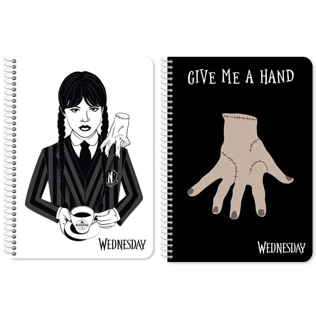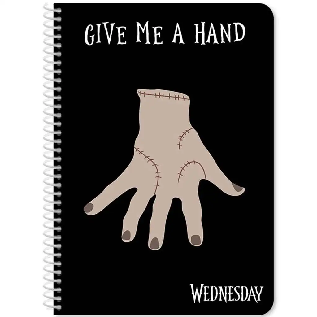 Učinite školsko bilježenje uzbudljivim s Wednesday spiralnom bilježnicom! Ova bilježnica od 60 listova, veličine 17x25 cm, dolazi u dva različita, impresivna dizajna koji će sigurno oduševiti vaše dijete. Na jednoj verziji prikazan je poznati izgled Wednesday Addams, kako pozira u crno-bijeloj odjeći s šalicom čaja, uz poznati lik ruke, Thing. Na drugoj verziji nalazi se natpis "Give Me a Hand" i lik Thing, što bilježnici daje jedinstven i zabavan izgled.