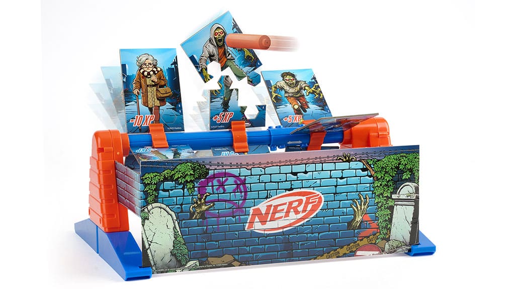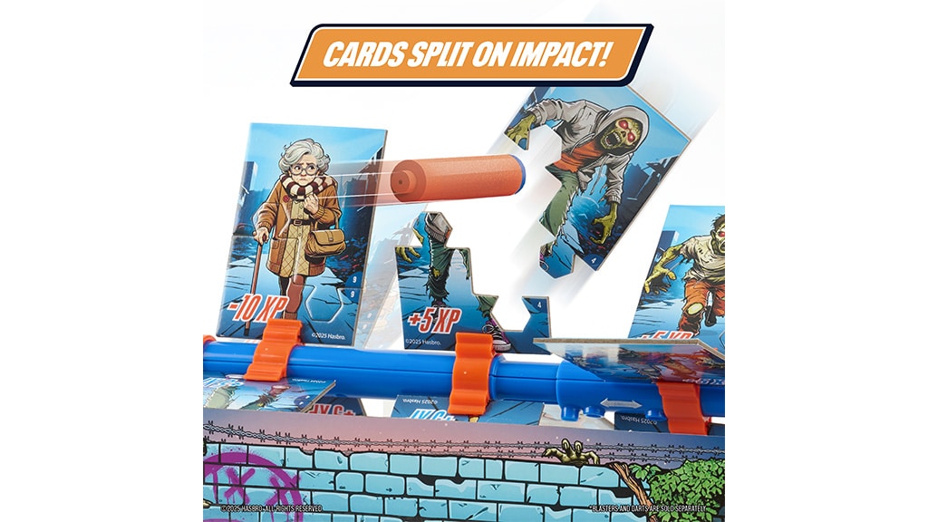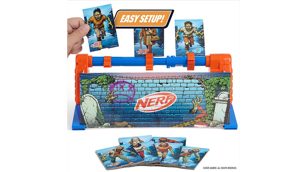 Djeca od 8 godina i starija stavljaju Zombie karte na rotirajući okvir NERF Zombie Strike, a zatim mogu birati između tri brzine: 15 sekundi spore rotacije, 30 sekundi brze rotacije ili 20 sekundi promjenjive brzine, tako da zabava nikada ne prestaje. Nakon toga, moraju pogoditi Zombie karte na rotirajućem okviru NERF mecima i ispaljivačima. Karte se lako raspadaju kada ih pogode, pa je igra jednostavna, bodovi se brzo prate i lako je ponovno započeti igru.