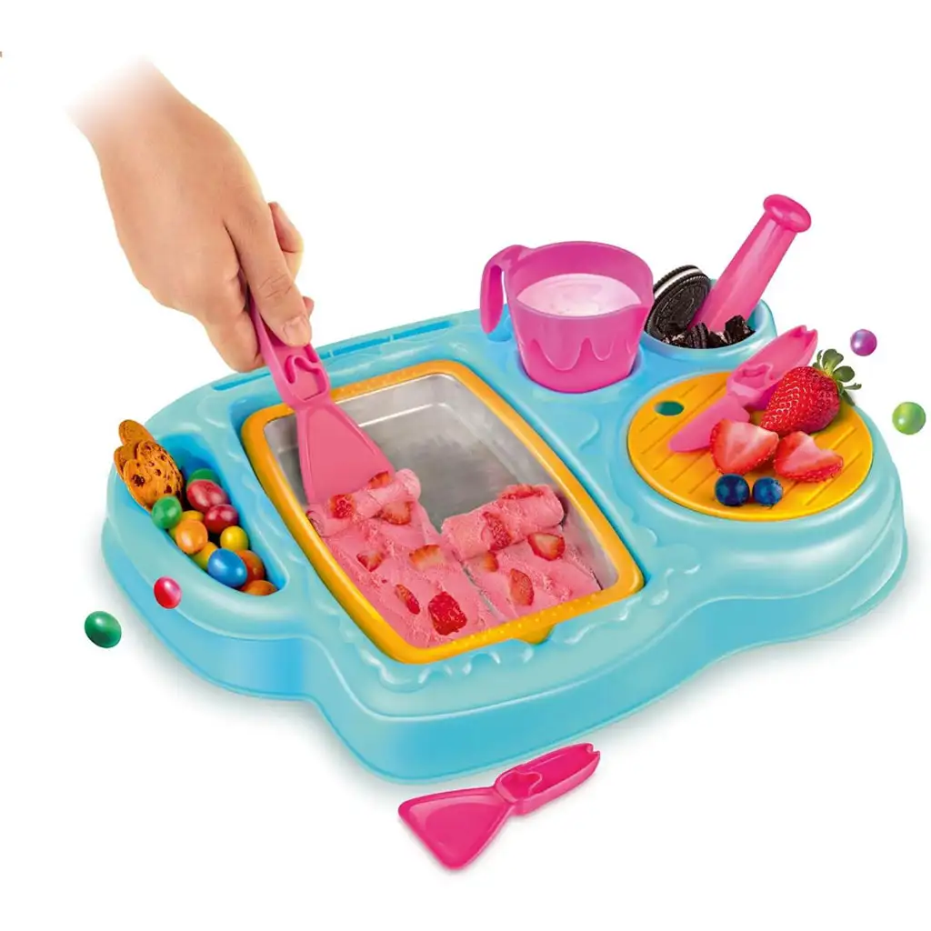 Zap Chef Ledeni Laboratorij prava je kuhinja iz snova za svakog malog slastičara! S ovim veselim, šarenim setom za igru, djeca mogu stvoriti vlastite sladoledne specijalitete, baš kao u popularnim sladolednim kamionima. Samo ulijte smjesu u zamrznutu metalnu posudu, pomiješajte s omiljenim sastojcima – voćem, keksima, bombonima – zatim izravnajte, zarolajte i vaš vlastiti rolani sladoled je spreman!