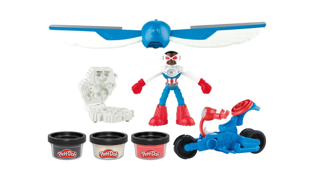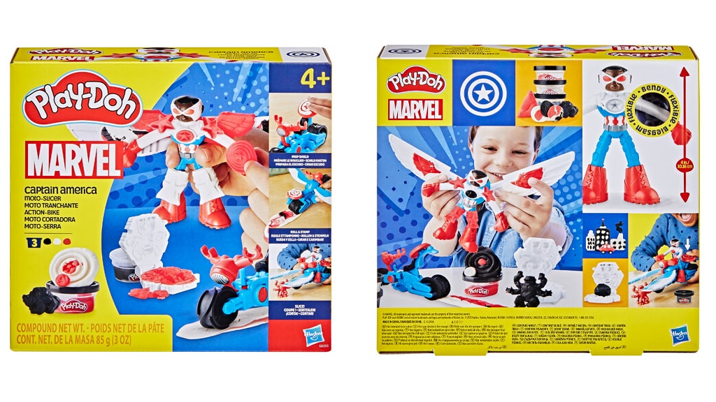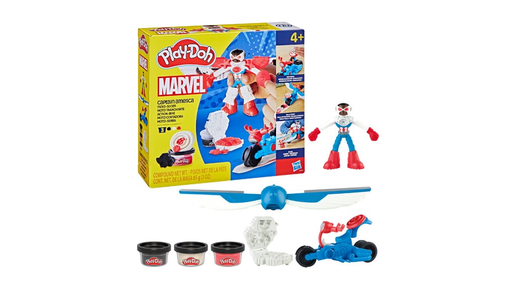 Ovaj set sadrži više oblika i četiri mini kutije Play-Doh gline, dostupne u zelenoj, crnoj, bijeloj, kao i mješavini crvene i plave boje. Djeca mogu koristiti priložene oblike kako bi izradila Play-Doh plašt za figuru Darth Vadera, stvorila pojas Lukea Skywalkera, oblikovala Play-Doh "svjetlosni mač" i čak izradila vlastiti mekani R2D2. Ova kreativna igra pruža djeci priliku da se urone u svijet Star Warsa, dok razvijaju svoju spretnost i maštu. Kombiniranjem različitih boja i oblika otvaraju se beskrajne mogućnosti za stvaranje novih avantura u galaksiji.Ovaj set sadrži figuru Sama Wilsona kao fleksibilnog Kapetana Amerike. Djeca mogu pričvrstiti figuru na motocikl (njegove ruke se čak mogu spojiti na upravljač), kotrljati motocikl preko šarenog Play-Doh-a kako bi napravili zvijezde, i također ga koristiti za rezanje! Djeca također mogu koristiti kalupe za stvaranje zlikovaca ili pričvrstiti 2-u-1 krila na Kapetana Ameriku.