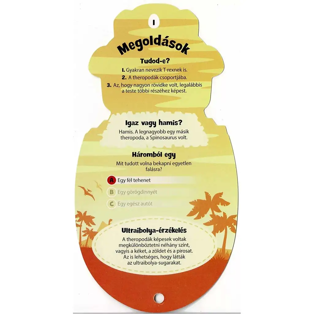 Karte sadrže tri vrste pitanja: brza pitanja, tvrdnje točno-netočno i kvizove s tri ponuđena odgovora, pa djeca tijekom igre mogu razvijati svoje znanje, razmišljanje i logiku. Znaš li, primjerice, koliki zalogaj je T-Rex mogao progutati jednim ugrizom? Ili koji je bio najveći mesožder među dinosaurima? Na poleđini karata ne nalaze se samo točni odgovori, već i dodatne zanimljivosti – svaka karta tako postaje mini otkriće!