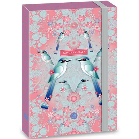Ova mapa Cataline Estrada sa svojim posebnim ptičjim uzorkom zasigurno će se svidjeti djeci, jer je svojim skladnim bojama i uzorkom nalik mandali jednako blistava koliko i korisna, pa će je djeca rado koristiti. Mapa je izrađena od gustog tvrdog kartona, a dizajn poput mape nadopunjen je snažnom gumenom trakom širine sedam milimetara koja učvršćuje poklopac. U ovu mapu možete staviti bilježnice, listove i knjige veličine A/4.