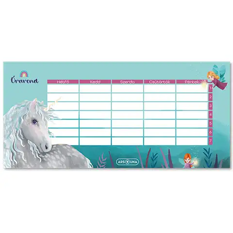 Djevojčice će obožavati ovaj raspored koji će ih osvojiti svojom bojom i motivima iscrtanim na njemu. Motivi su jednorog i vilinsko plavo, koje su omiljene mališanima. Raspored Ars Una sastoji se od jednog lista, ali je dvostrano dizajniran, tako da na njemu možete označiti tjedne A i B. Raspored je na mađarskom jeziku, izrađen od 250g polusjajnog papira za umjetnički tisak čije su boje prekrasne i po njemu se može pisati olovkom i olovkom. Raspored stane u većinu držača za olovke tako da je uvijek pri ruci i na vidiku.