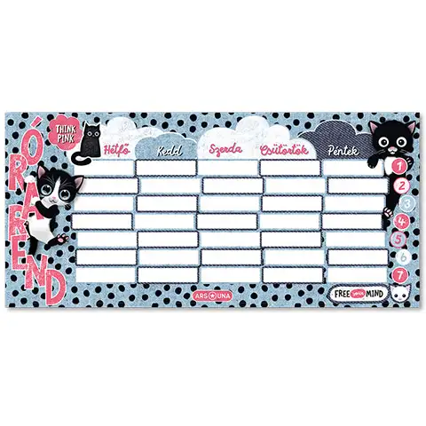 Školski pribor vašeg djeteta možete obogatiti dvostranim rasporedom koji ima sedam rasporeda A i B, tako da je lako pratiti promjenu tjednog rasporeda. Vozni red tiskan je na 250 g polusjajnom umjetničkom papiru tehnologijom tiska u 4 boje, što rezultira svijetlim i jasnim bojama. Think Pink satnica govori o mačkama, jer su na njenoj površini iscrtane male životinje koje ga čine još privlačnijim za djecu. Osim toga, dizajn je vrlo zanimljiv, a pristaju mu sve boje i motivi. Raspored je dimenzija 232 x 109 mm, idealne veličine za vašu školsku torbu ili kućni stol. Raspored je praktičan i estetski, što je odličan dodatak školskoj godini.
