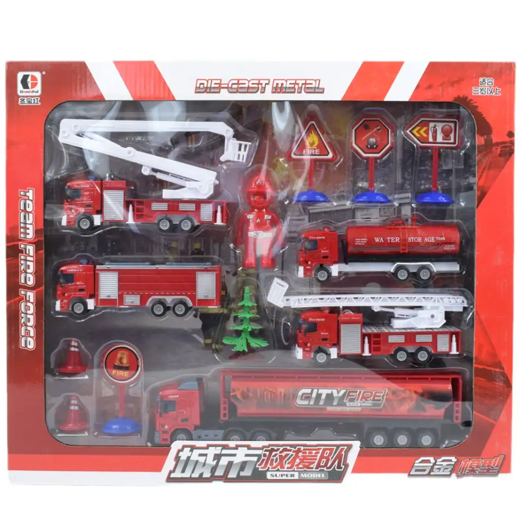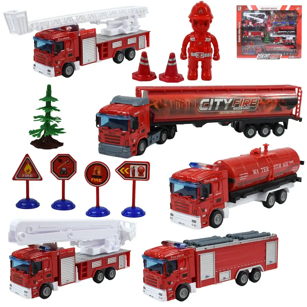 Sadržaj vatrogasnog seta igračaka izuzetno je bogat i raznovrstan. Set sadrži: kamion, dva vatrogasna vozila sa ljestvama, vatrogasno vozilo sa cisternom, vatrogasno vozilo, dvije plutače, četiri različita znaka, figuru i drveni element. Razna vozila i brojni dodaci daju djeci priliku da oslobode svoju kreativnost i maštu i igraju razne misije spašavanja.