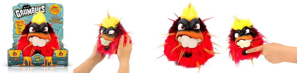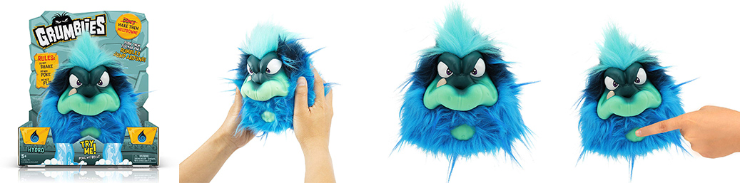 A Grumblies szörnyecskéi mind ingerült, kicsit gonosz és elszánt arckifejezést öltöttek magukra, ami nem is csoda, hiszen hatalmas erő lakozik bennük. A szörnyecskék mind egy-egy természeti jelenséget képviselnek. Tapintásuk nagyon puha, hiszen egész testüket szőrme fedi, de ennek ellenére nem biztos hogy jó ötlet megölelgetni őket, hiszen nem kifejezetten szeretik. A kis lények belsejében lévő szerkezetnek köszönhetően amint megrázod, megöleled vagy megnyomod a hasán lévő gombot, elkezdenek gyorsan mozgolódni, ami ezzel az arckifejezéssel együtt nagyon rémisztő is tud lenni. Ekkor már teljesen egyértelmű lesz, hogy épp a természet erői gyűlnek össze bennük, és nemsokára ki is tör, és indulhat is a móka.