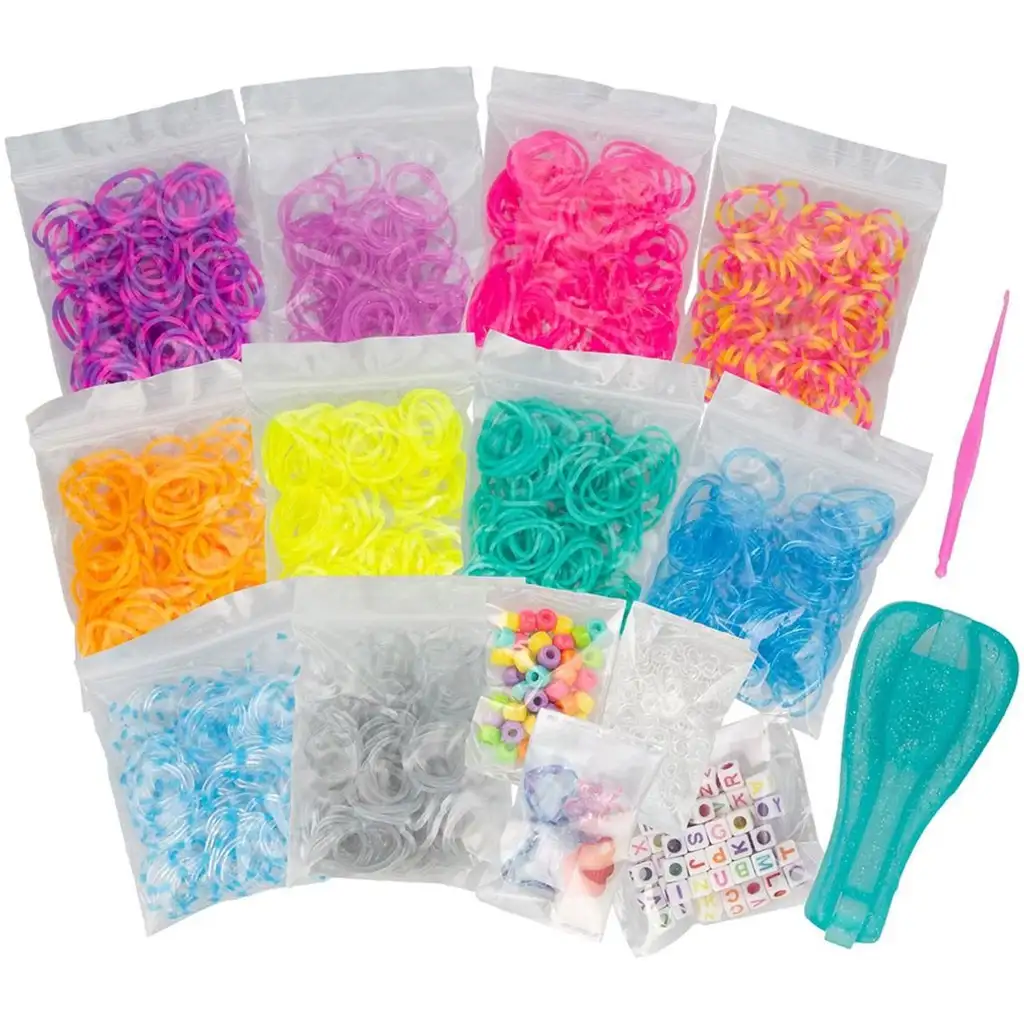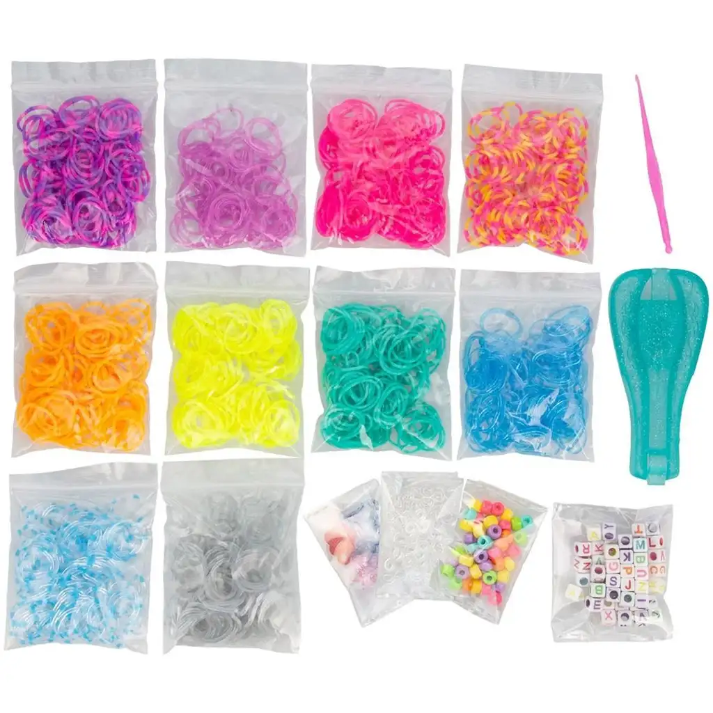 Paket sadrži 1000 komada gumica u različitim bojama, pa su mogućnosti kombiniranja uzoraka i boja gotovo beskrajne. Zahvaljujući priloženim perlicama s abecedom, kao i šarenim perlicama, mogu se na narukvice dodavati i imena ili poruke, čime narukvice postaju još osobnije. Set također uključuje praktičnu kukicu i novu, šljokičastu EZ Loom napravu za izradu narukvica, što izradu čini još jednostavnijom i bržom.