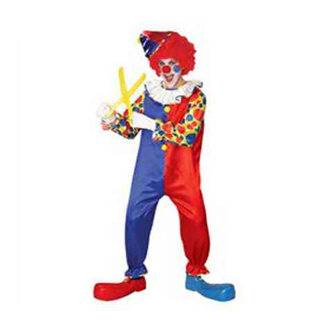 Ovaj je kostim za klaune izrađen od klasičnih boja kao što su plava, crvena, žuta. Na okovratniku kostima se pojavljuju lijepi ukrasi sa šarenim šavovima. Velika žuta dugmad čine odjeću vrlo veselom. Kostim se pomalo sjaji. Lako se čisti, materijal je odličan. U setu se samo klaunska odjeća nalazi, ostali dodaci kao nos i perika se posebno mogu kupiti.