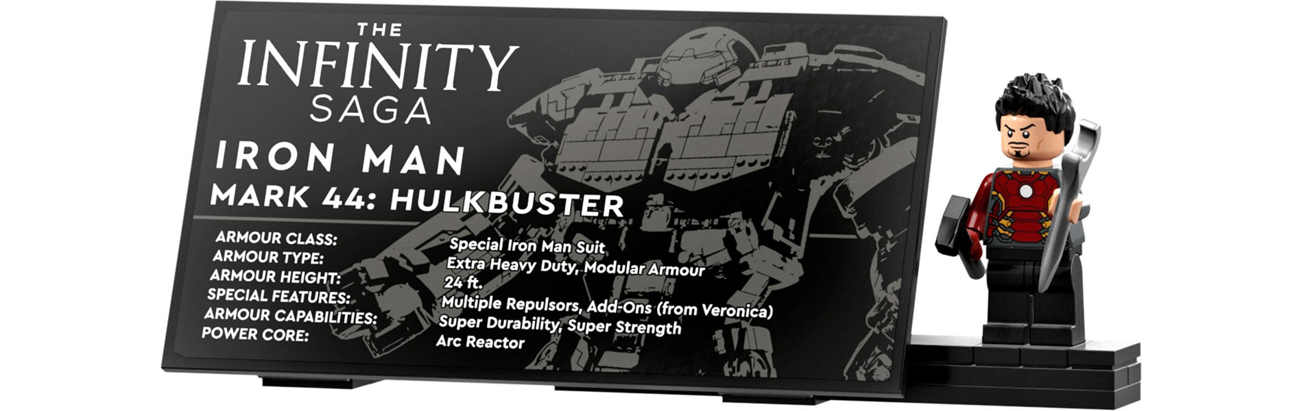 Prikladno za postav usmjeren na izložbu, postojat će mali stalak uparen s pločom koja uključuje informacije o Mark 44 Hulkbusteru. LEGO Group također uključuje ekskluzivnu novu verziju Tonyja Starka, koji dolazi napola odjeven u oklop Iron Mana.