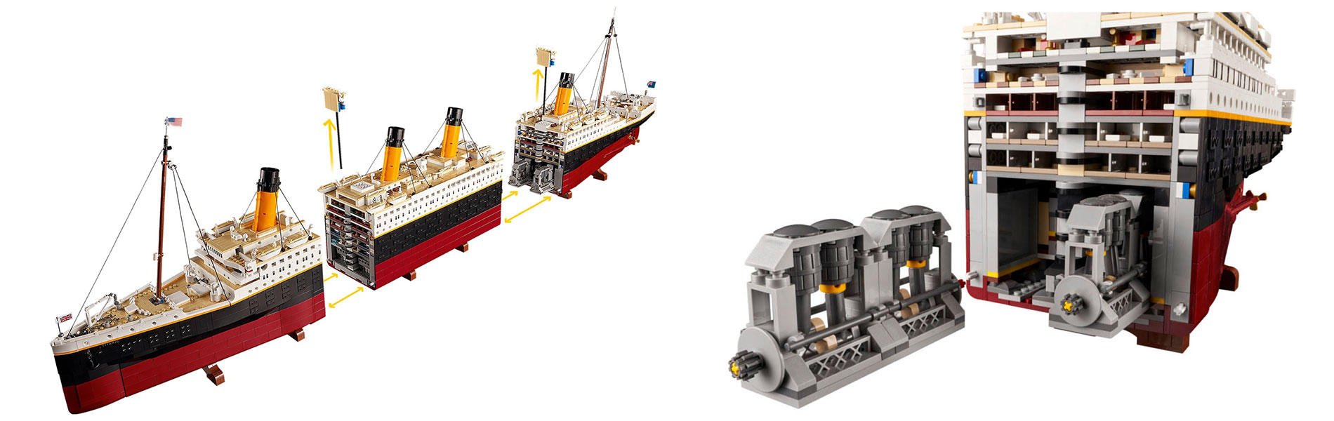 Osim po veličini, Titanic je bio poznat i po svom neusporedivom sjaju, koji je prizor vjerno zabilježio. Pod nepogrešivim vanjskim izgledom LEGO Titanica, graditelji mogu istražiti brojne interijere, uključujući prvoklasno veliko stubište koje se proteže na šest paluba i blagovaonicu u jakobinskom stilu koja se nalazila na palubi D broda.